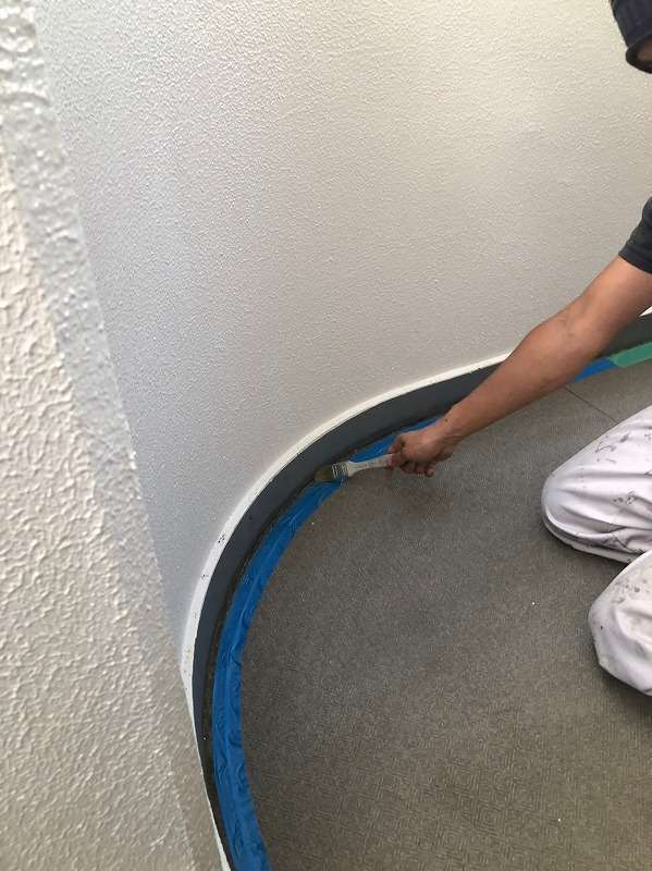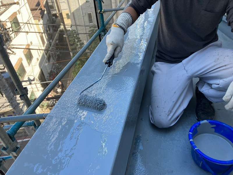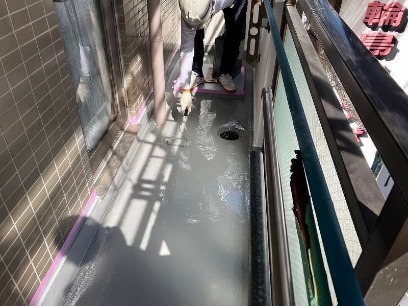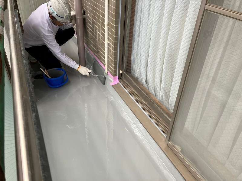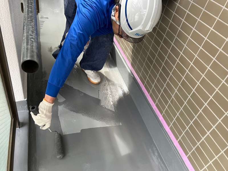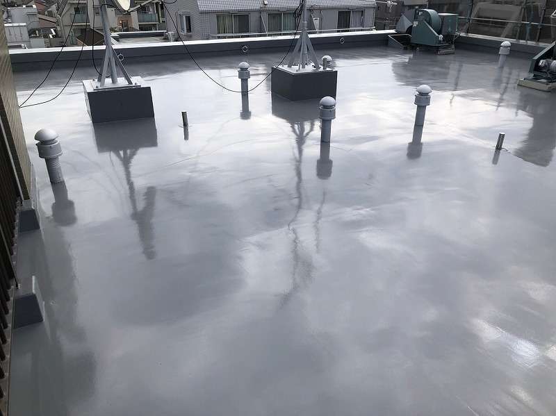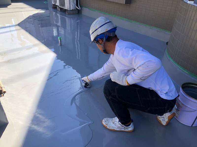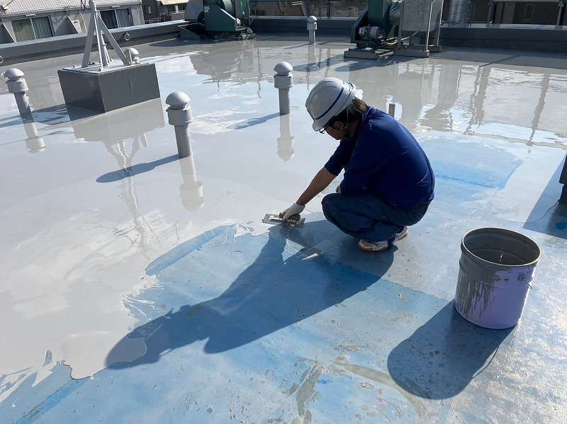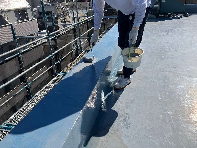既存層を丁寧に清掃・下地調整したのち、ウレタン塗膜防水を複数層で塗り重ね、立ち上がりや入隅部もヘラとローラーを使い分けて施工。排水ドレン廻りも慎重に処理し、仕上げにトップコートを塗布して防水層を保護しました。