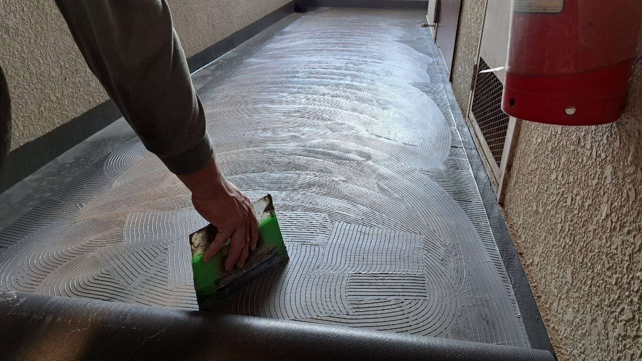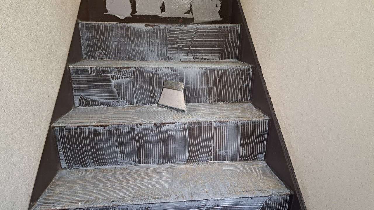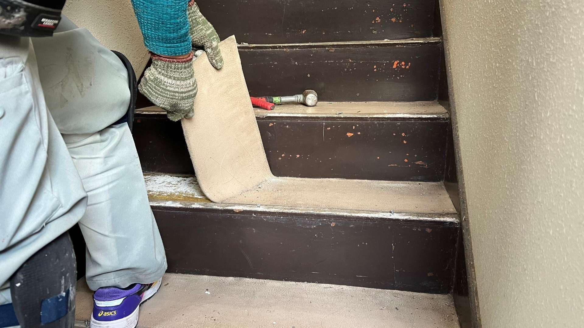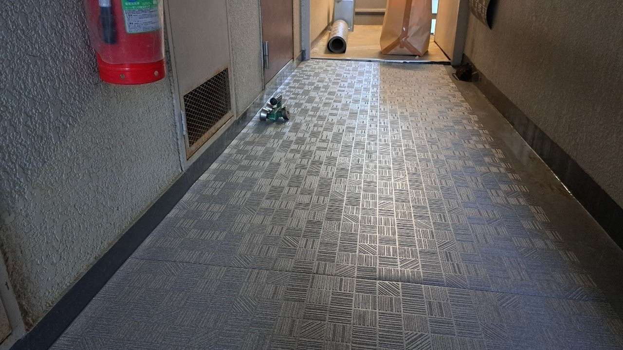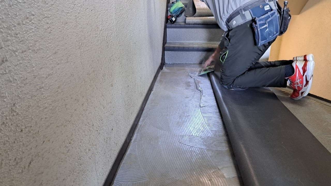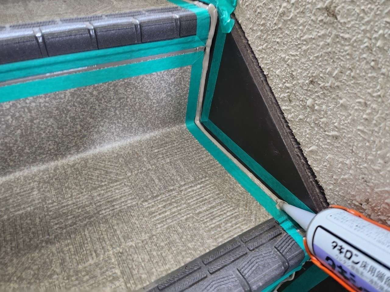 共用部では既存シートの浮き・汚れ・劣化が進んでいたため、撤去後に下地研磨・清掃を徹底し、プライマー塗布・専用接着剤塗布ののちに新規シートを慎重に圧着。端部にはシーリングを充填し、防水性と意匠性を両立しました。階段にはノンスリップ踏面材を採用し、安全性を向上しています。
