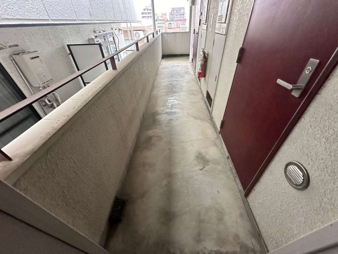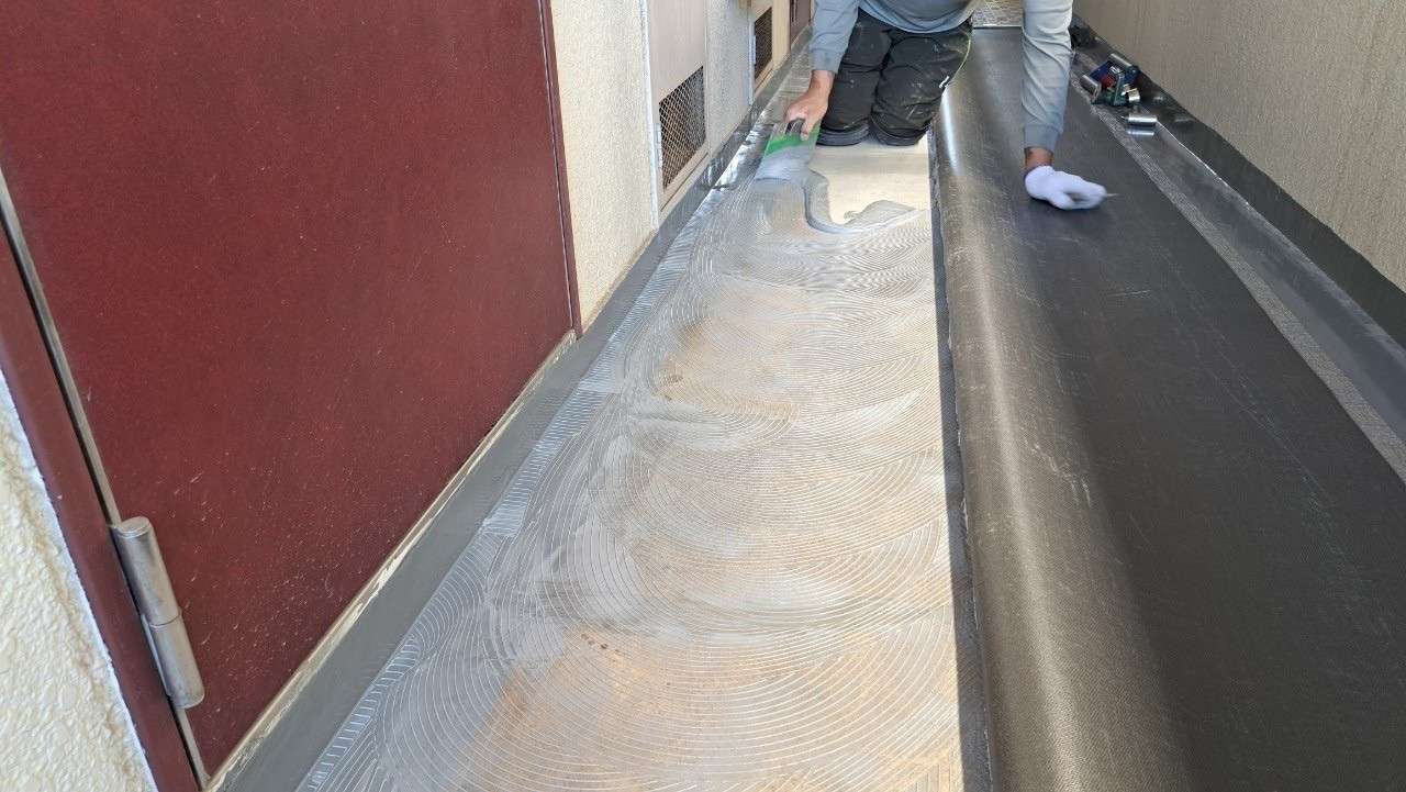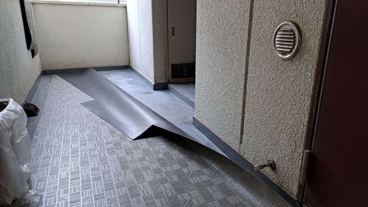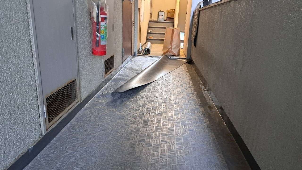 本工事では、まず建物全体の防水性能向上を目的に屋上防水工事を実施し、その後に共用廊下・階段の長尺シート貼替工事を行いました。こちらのビルは廊下に側溝がなく、雨天時には通路に水が溜まる状況だったため、ウレタン防水の上に長尺シートの厚みを活かして排水経路を確保し、簡易的な側溝機能を持たせる施工方法を採用しました。