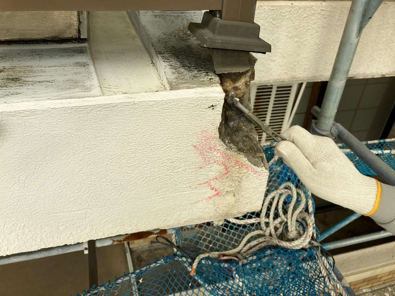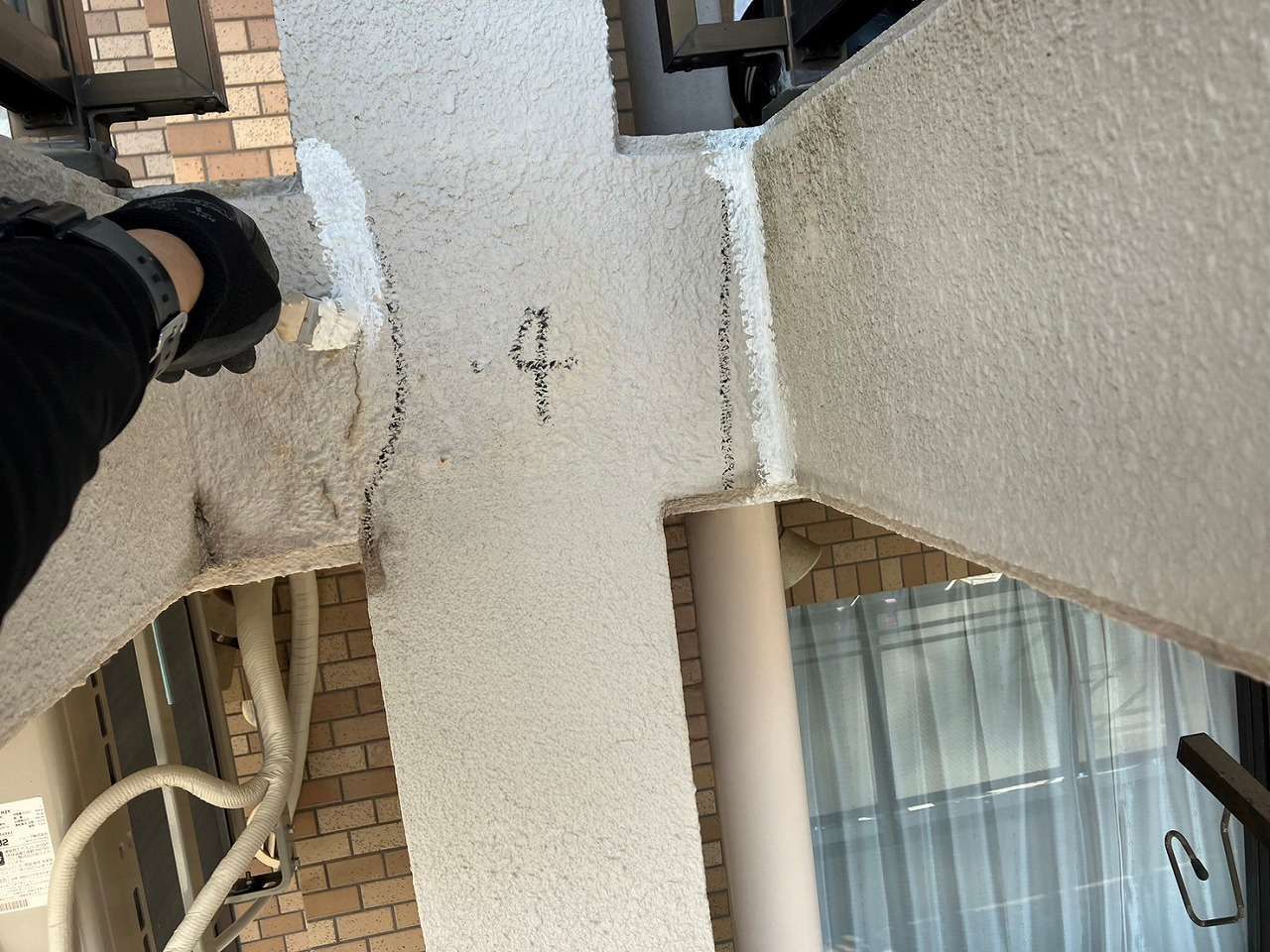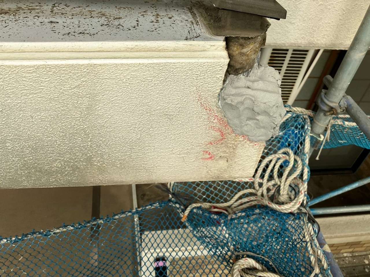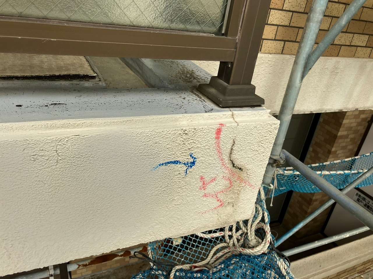 神奈川県金沢市の建物にて、外壁の欠損・ひび割れ・鉄筋爆裂が複数箇所で確認されたため、早期の安全確保と美観回復を目的に外壁修繕工事を行いました。まず劣化部をマーキングしたうえで、爆裂して浮いている既存モルタルを丁寧にはつり、腐食した鉄筋をケレン処理して防錆材を塗布。その後、樹脂モルタルを用いて欠損部を成形し、既存の模様に合わせるように丁寧に肌合わせを実施。最後に下塗り・中塗り・上塗りを行い、周囲との一体感ある仕上がりに復元しました。細部のひび割れにはシーリング材を充填し、防水性も向上。耐久性、美観ともに改善された施工となりました。