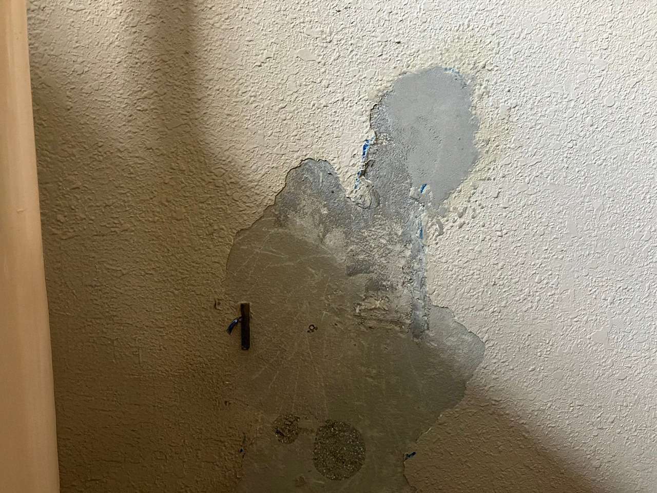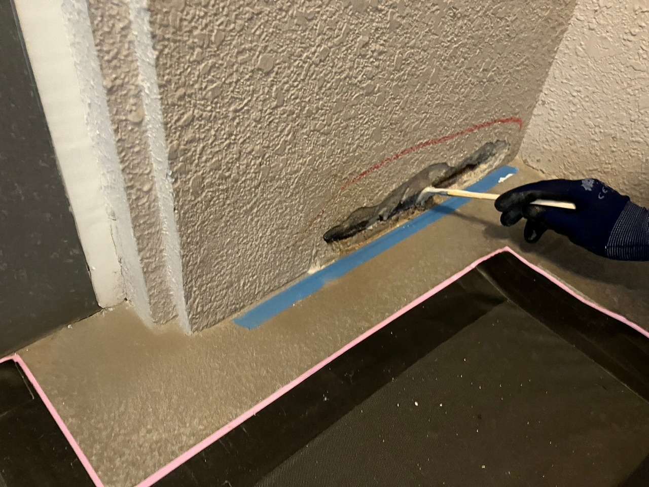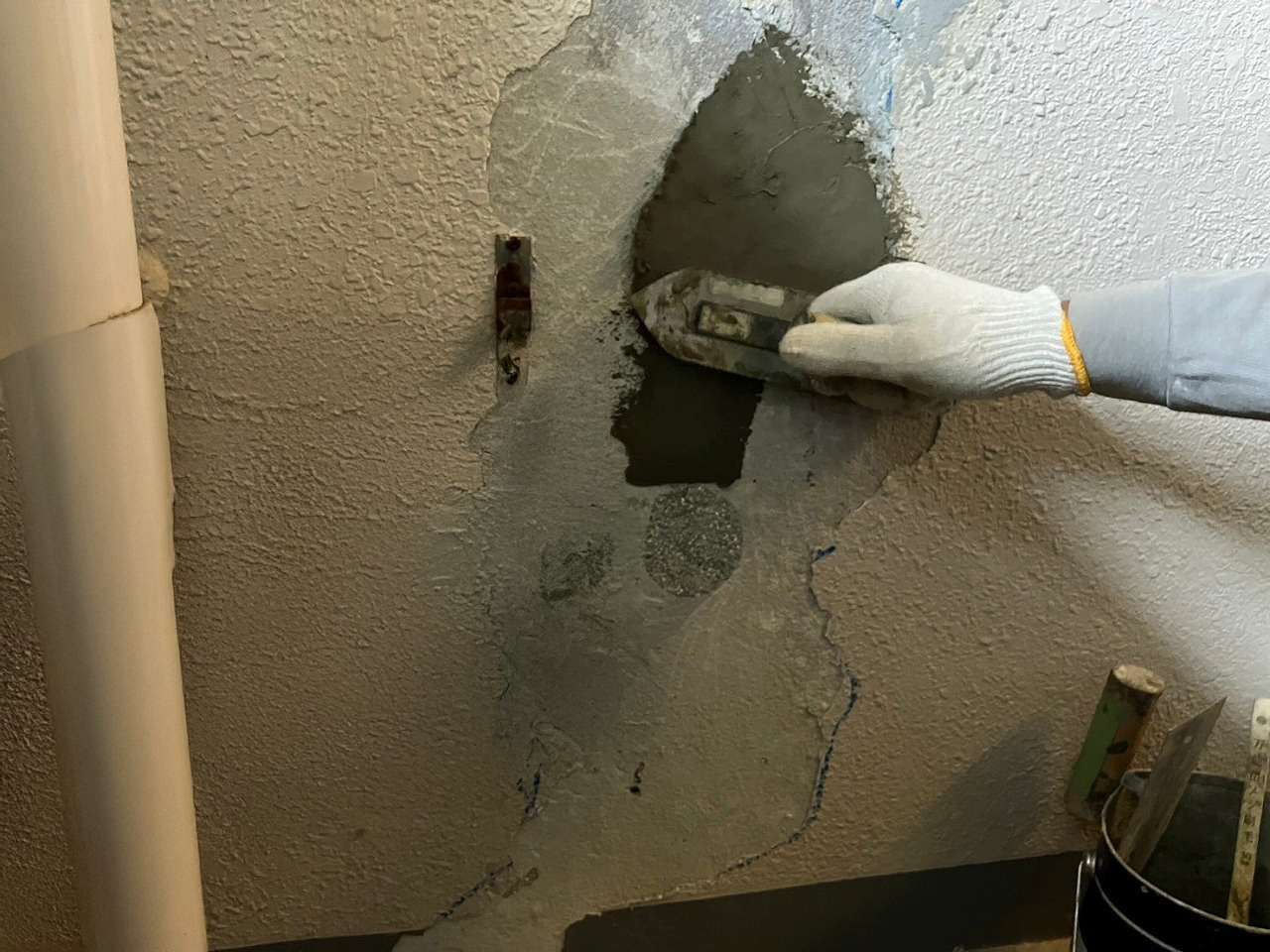 神奈川県金沢市の外壁修繕工事です。内部廊下の壁面で、欠損や鉄筋爆裂が確認されたため、はつり・鉄筋防錆後、サンレジン樹脂モルタルで補修を実施しました。既存の凹凸模様に合わせて成形し、美観を損なわない仕上がりを確保。内部の安全性と耐久性を高める重要な工程となりました。