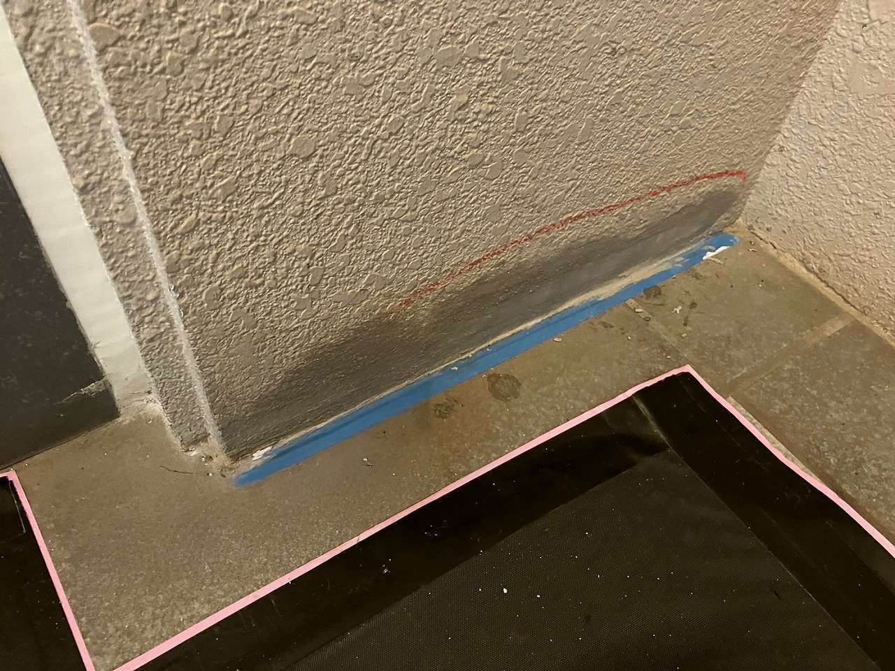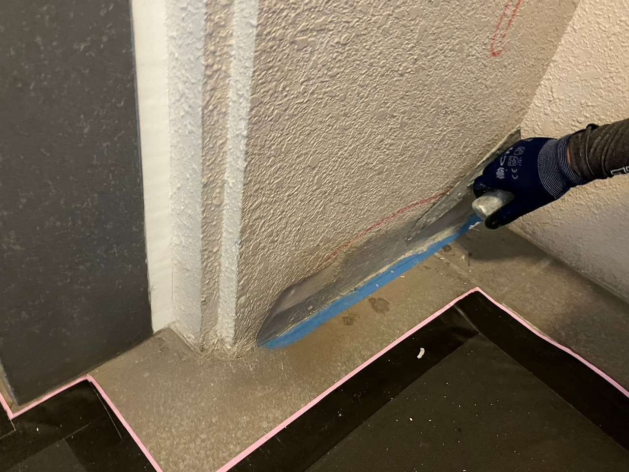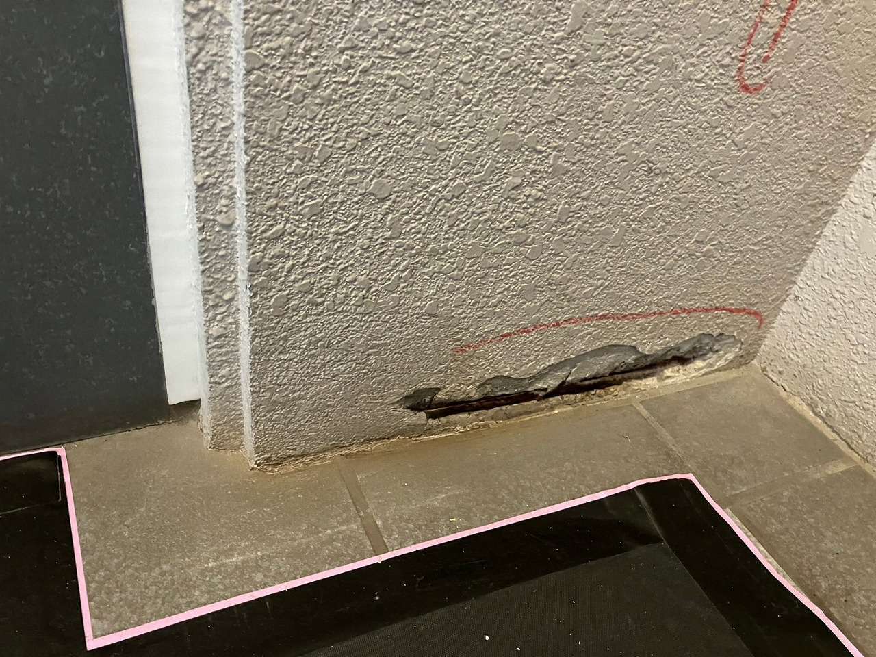神奈川県金沢市の外壁修繕工事です。内部廊下の壁面で、欠損や鉄筋爆裂が確認されたため、はつり・鉄筋防錆後、サンレジン樹脂モルタルで補修を実施しました。既存の凹凸模様に合わせて成形し、美観を損なわない仕上がりを確保。内部の安全性と耐久性を高める重要な工程となりました。
